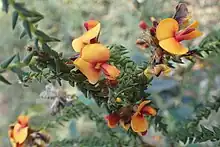 Pultenaea skinneri, commonly known as Skinner's pea,[2] is a species of flowering plant in the family Fabaceae and is endemic to the south-west of Western Australia. It is a slender shrub with simple leaves, and yellow, red and orange flowers with red markings.