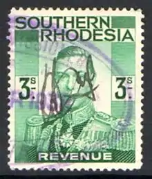 Southern Rhodesia became a separate colony in 1923, and in 1924 its first revenue issues portraying King George V in a military uniform were issued. These were replaced by a new issue portraying an elderly King George in 1930. Following his death, in 1937 a set showing the new monarch King George VI was issued. This had nine values from 3/- to £50. The rarest value is the 7/6 black as it was withdrawn soon after issue, and genuinely used stamps can now fetch over £3000. In 1954, a large set showing the coat of arms was issued with values ranging from 1d to £50. In the 1930s, banderole excise stamps were used to pay cigarette taxes. From around 1937 to the 1940s, various postage stamps were handstamped EXCISE or E for the same purpose. Between 1961 and 1964 various stamps were issued for Personal Tax. These exist with various roulettes, perforations and combinations of both.
