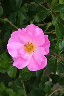 Rosa × kordesii, or Rosa kordesii, is a red type of rose that arose naturally from hybridization followed by chromosome doubling. A hybrid between R. rugosa and R. lucieae was created called Rosa 'Max Graf', but it was diploid and nearly sterile, producing flowers but no fruit. This rose produced a few viable seeds as a result of self-pollination, and the seedlings that resulted were tetraploid instead of diploid, i.e., the chromosomes of both pollen and egg cells had been naturally duplicated. The tetraploid seedlings are amphidiploids.[1] A selection with double deep pink flowers and repeat bloom, also called 'K01 AgCan' was released by W. Kordes' Söhne in 1951.[2]