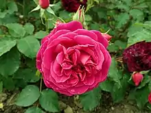 'Munstead Wood' is a short, bushy spreading rose, 2 to 3 ft (0.61–0.91 m) in height, with a 2 to 3 ft (0.61–0.91 m) spread. The plant is a vigorous grower. The rose has a strong, old rose fragrance. Its flowers are average in size, 3.75 in (95 mm), with a cupped, old rose bloom form. Flower colour is a deep, crimson with lighter coloured outer petals. 'Munstead Wood' blooms in small clusters throughout the season. Leaves are medium-sized and a matte, medium green colour.[1][2]