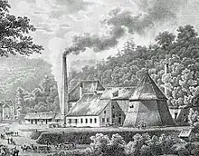 In 1819, the first ever steam engine was installed in a shaft at Ronchamp, capable of lifting 400 skips a day.[5] It was an English engine with a pendulum, condenser, low-pressure piston 0.45 meters in diameter and 10 bhp; it was manufactured in Mr. Rottewel's workshops in Boston. In addition to the extraction coil, this machine operated two sets of 0.19-meter-diameter pumps.[5] In October 1823, the Saint-Louis shaft cut through the first layer of the Stephanian coalfield at around 90 meters from the surface, with drilling stopped at 100 meters.[6] Reaching this depth for the first time in the Ronchamp coalfield, it was nicknamed the "great shaft".[6]