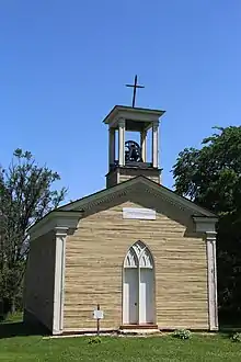 The church is a small wooden structure on a limestone foundation.[2] The general form of the building is Greek Revival, seen in the low-pitched roof and the cornice returns. But smaller elements are Gothic Revival: the pointed arches on the door and windows and in the corner pilasters, the pointed corbeling under the raking cornice. The walls are clad in 9-inch wood planks grooved to look like stone blocks. The exterior was never painted. On top is a spare bell tower styled like the rest of the church, topped with a small cross.[5]