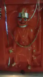 In order to locate and secure the site of Temple, the ruler Acharya envisioned in meditation an idol of a god wearing a crown and smirking while riding a lion with a drum in his right hand, an ewer in his left hand, a knife in his waistband with many ancient symbols embossed on it, a beast under its right leg and a small animal near its left foot. It is said that the famous Mughal emperor Aurangzeb and his army expedition destroyed every Jain and Hindu temple between Delhi and Mandav, and although the emperor passed through a royal route while on expedition, the power of the god prevented him from noticing it before he destroyed it. The ruins of Mandav temples are proof of the expedition's destruction. Noteworthy is the Agarji Shantinath temple in Ratlam, which was protected at the time of the expedition by those who erected towers overnight. Over time due to the frequent coating of saffron, the idol's features became distorted such that pilgrims mistook it for a god Manibhadra idol. But the coating cracked in 1990 and the original features of the idol can now be clearly viewed. As there is no description of such a God in Jain manuscripts, people now worship them as god Bherujis.