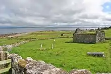 Curative powers were also ascribed to earth coming from the saint's grave. The prerogative of administering it to visitors belonged to the Machan (Maughan) or Loughney family, presumably because the family was known to descend from the erenachs (wardens) of the church.[1] A flagstone at the saint's grave known as Leac Cuimín (The stone of Cuimín) is thought to have been used as a 'cursing stone' under similar guidance: members of the Machan (Maughan) or Loughney [6] family could be asked to perform a ceremony to call down maledictions on people who had caused harm to others.[1][7] The practice came to an end in the first half of the 19th century, when a dean by the name of Lyon had it removed "for certain weighty reasons" and built into the wall of the cathedral at Ballina, County Mayo.[7]