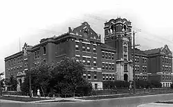 Designed by Winnipeg school architect J. B. Mitchell and built between 1910 and 1912, St. John's Technical High School opened for classes in 1912.[2] Its twin, Kelvin Technical High School, opened around the same time for students from the southern part of the city. With exteriors of Tyndall stone and red brick, the interior floor plans for the two schools were identical.[3]: 187 The basement housed rooms for “technical” instruction in machining, woodworking, electrical work, mechanical drawing, and plumbing; dressing rooms for the gymnasium; the boiler room; four toilets; and two offices for teachers.[3]: 189