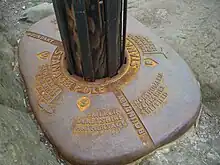 On 17 April 2016 a group of people with an interest in the pole and surrounding environment, including the Peak District National Park Authority and the British Mountaineering Council, erected a new pole at the site to mark the 65th anniversary of the creation of the Peak District National Park. Support for the renewal also came from the Hope Cement Works, The Durham Foundry (Sheffield) Ltd, The Cutler's Company, Sheffield Clarion Ramblers and some public subscriptions. The new pole is formed from a locally felled larch tree, with a frame made by Hope Cement Works, and a base cast in Sheffield.[7] The base is cast from ductile iron and has information cast into it (see photograph).[8]