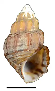 Apertural view of a shell of Sulcospira tonkiniana. Scale bar is 10 mm. | |
