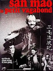 The Adventures of Sanmao the Waif (also known as The Winter of Three Hairs, Wanderings of Three-Hairs the Orphan or An Orphan on the Streets) (三毛流浪记) is a 1949 Chinese film released by Kunlun Film Company, directed by Zhao Ming[1] and Yan Gong. The 1949 film is based on the Sanmao comic, created by Zhang Leping in 1935 and features the well-known Chinese cultural symbol of child poverty, Sanmao (meaning "three hairs"), a homeless orphan boy. The film, which stars Wang Longji, follows Sanmao through his adventures surviving and meeting new people on the streets of Shanghai. The film notably works to counterbalance the tragic story of Sanmao with humor and comedy. Sanmao's visual image of a small boy with a big head and three hairs is well-known amongst Chinese people both old and young.[2]