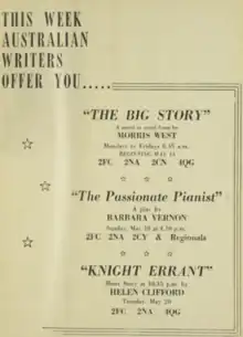- ↑ Australian Broadcasting Commission. (1939), "All the RADIO Programmes 2FC-2NA (FROM 5.59 a.m. TO 12.30 p.m.)", ABC weekly, Sydney: ABC (Vol. 20 No. 23 (4 June 1958)), nla.obj-1436690287, retrieved 13 December 2023 – via Trove
