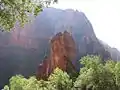 The Pulpit is a 4,600-foot (1,400 m) elevation Navajo Sandstone pillar located in Zion National Park, in Washington County of southwest Utah, United States.[2] The Pulpit is situated in the Temple of Sinawava at the north end of Zion Canyon, rising 160 feet (49 meters) above the canyon floor and the North Fork of the Virgin River which drains precipitation runoff from this rock. It is a photographic icon seen from the parking area at the end of Zion Canyon Scenic Drive, and the entrance to The Narrows. Neighbors include Mountain of Mystery to the north, Observation Point to the southeast, Angels Landing and The Organ to the south, and Cathedral Mountain to the southwest. The first ascent was made April 15, 1967, by Fred Beckey, Eric Bjornstad, Hal Woodworth, Pat Callis, and Galen Rowell.[3]
