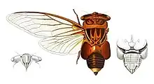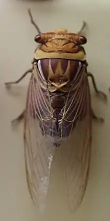 The northern double drummer is a large species of cicada, the second largest in Australia,[1] just smaller than the largest species, the double drummer. The male and female average 4.56 cm long. The thorax is 1.85 cm in diameter.[2] The eyes are light brown tinged with purple,[2] and the postclypeus dark red-brown. The head is variable in colour, but never black like the double drummer.[1] The thorax is brown with lighter golden-brown markings.[2] The mesonotum is brown tinged with purple. The underside of the thorax is red-brown and covered in fine silvery velvety hairs. The abdomen is dark brown, with the first and second segments above and underside covered with grey hairs, and also a whitish pregenital band of hair. The wings are vitreous (transparent) with light brown veins. The legs are brown and have fine grey velvety hairs.[2]