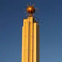 The building features an 80-foot (24 m) concrete tower fitted with neon tube lighting and capped by a pronged orb with neon lights. A cantilevered marquee wraps around the entrance, appearing to be supported by a hexagonal box office.[8]