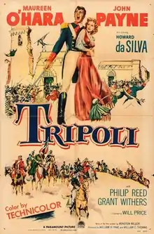 Tripoli is a 1950 American adventure film directed by Will Price and written by Winston Miller. The film is a fictionalized account of the Battle of Derna at Derna, a coastal town in modern eastern Libya in April 1805 against Tripoli, one of the four Barbary states in North Africa and stars John Payne, Maureen O'Hara, Howard Da Silva, Phillip Reed, Grant Withers, Lowell Gilmore and Connie Gilchrist. The film was released on November 9, 1950, by Paramount Pictures.[2] The film was re-released by Citation Films Inc. and retitled The First Marines.