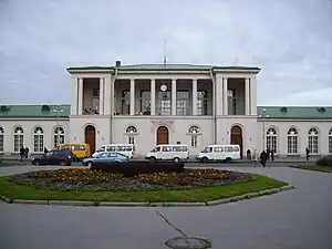 Tsarskoye Selo railway station (Russian: станция Царское Село) is a railway station located in Pushkin, Saint Petersburg, Russia. It is 23 km down-line from Vitebsky railway station and is situated between Shushary and Pavlovsk on the Saint Petersburg – Vitebsk line. The station hosts suburban trains from Saint-Petersburg, Novolisino, Posyolok, Oredezh, Luga and Veliky Novgorod. Electric trains ED4M, ER2T and DT1 make passenger trips from Tsarskoye Selo station. Long-distance trains do not stop at Tsarskoye Selo station except for trains from Velikiye Luki. The station is approximately 1 km from the town center. It has official status as an object of Russian cultural heritage.[2]
