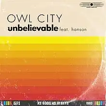"Unbelievable" is a song by American electronica project Owl City. The song was released on June 26, 2015 as the third and final single from his fifth studio album, Mobile Orchestra. The track features American pop rock band Hanson.[2]