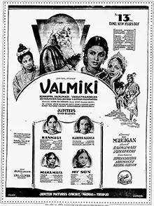 Valmiki is a 1946 Tamil-language film starring Honnappa Bhagavathar, U. R. Jeevarathinam, N. C. Vasanthakokilam, T. R. Rajakumari and T. S. Balaiah. It was directed by Sundar Rao Nadkarni.[2][3]