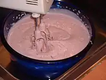 In Sweden, it's usually made by adding lingonberry cordial to the water, in which the semolina is cooked, as the texture is supposed to be smooth, so you don't want little bits of berries in the porridge. Alternatively, the berries are strained out before the semolina is added. After the mixture has cooled down, the porridge is vigorously whipped to a light, mousse-like consistency. Alternatively, the pot the porridge was made in, can be put in the kitchen sink, partially filled with cold water and whisked it in the pot, so it cools down while being whisked with a hand mixer. The dessert is usually served with milk and optionally sugar. Other berries and fruit that can be used are redcurrants, cranberries, apricots, gooseberries and strawberries.[1] The name "russe" may refer to the color after it has been whipped[2] or that the dessert has a connection with Russia.[3]