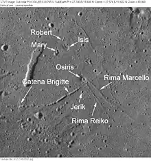 Isis and nearby Osiris are located on conical uprises situated along a rille and are interpreted as small volcanic cones.[1][2][3]