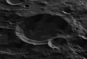 The most notable feature of this crater is the dark-hued floor, created when the interior was resurfaced by lava flows that had a lower albedo than the surrounding terrain. The outer rim is nearly circular, but broken in the northeast by a smaller overlapping crater. The inner wall has the same albedo as the surrounding terrain, and marks the perimeter of the flooded floor. The rim is somewhat worn, particularly in the north next to the overlapping crater. On the floor is a lobate scarp that was formed as a result of contraction of the lava. The scarp extends southward across the middle of the crater, past the rim and onto the surrounding highlands.[1]