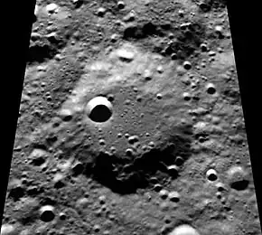 Poinsot is a worn lunar impact crater that is located at the northern part of the Moon on the far side. It lies to the south of the walled plain Rozhdestvenskiy. To the south is the smaller crater Heymans.