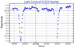 ![]() A light curve for V1315 Aquilae, from data taken on 31 August 2004. Adapted from Papadaki et al. (2009)[1] | |