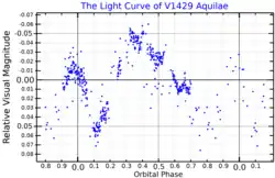 V1429 Aquilae shows brightness variations of about 0.3 magnitudes and a detectable period of 4.16 days. No longterm variations in brightness have been detected over several decades of observations.[13] The profiles of many spectral lines also vary with the same period, produced partly by radial velocity variations.[14] The absorption and emission lines show different radial velocity amplitudes, but with the same period. Most of these variations can be accounted for by the orbit of the two stars and material being transferred from the primary to the secondary, with the gas being involved in partial eclipses,[6] and possibly also partial eclipses of the stars themselves.[8] The two stars are also distorted into ellipsoidal shapes by their gravity and vary in brightness as they rotate.[6]