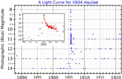 V604 Aquilae or Nova Aquilae 1905 is a nova which was first observed in the constellation Aquila in 1905 with a maximum brightness of magnitude 7.6.[3] It was never bright enough to be seen with the naked eye. It was discovered by Williamina Fleming on a Harvard College Observatory photographic plate taken on August 31, 1905.[6] Examination of plates taken earlier indicates that peak brightness occurred in mid-August 1905.[7] The star's quiescent visual band brightness is 19.6.[5]