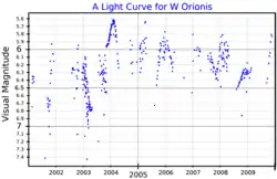 W Orionis is a semiregular variable with an approximately 212‑day cycle.[5] A long secondary period of 2,450 days has also been reported.[10]