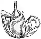 Maize—Zea Mays—unripe cob. The membranous spathes have been cut and drawn aside, revealing the spike of fruit which bears the long silky styles. One-third nat. size.