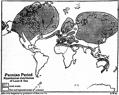 The character of the fossils in the Permian of the Mediterranean and south-east Europe-well exemplified in the deposits of Sicily—together with their more generally calcareous nature, indicate a more open sea and more stable marine conditions than obtained farther north. This sea is traceable across south-east Russia into the middle of Asia, through Turkestan and Persia, into the Salt Range of India, where the Productus limestone may be taken as representative of the normal marine plan of Permian times. Southwards, however, of the Nerbudda River another and quite distinct continental assemblage of deposits holds the ground, viz. the lower portion of the great fresh-water Gondwana system. The coarse Talchir conglomerates at the base are succeeded by the sandstones and shales of the Karharbari group, with numerous coal seams, and these in turn are followed by the Damuda series (upwards of 10,000 ft.) of similar rocks, with ironstones and very valuable coal seams. All these strata are characterized by the presence of the Glossopteris flora. A similar succession of beds has been recorded in north-west Afghanistan. In close relationship with the lower members of the Indian Gondwana series, both as regards fossil contents and lithological characters, are the lower Karoo beds of South Africa (Dwyka conglomerate, Ecca shales and mudstones, Beaufort beds and Kimberley shales), also the coal-bearing beds of the Transvaal; the Permo-carboniferous rocks of Australia (including the rich coal measures of Newcastle, the Greta coal measures and marine beds, upper and lower, of New South Wales; those of Tasmania, the Bowen River beds of Queensland, and the Bacchus Marsh glacial beds of Victoria), and similar rocks in New Zealand (Maitai formation, south island; Dun Mountain limestone and Rimutaka beds of the north island) and South America. In North America Permian rocks occur in the east in Pennsylvania, West Virginia, Maryland and Ohio ("Upper Barren Measures"), and in Prince Edward Island, New Brunswick, where they succeed the Carboniferous rocks very regularly. West of the Mississippi, in Texas (7000 ft, including the Wichita beds, Clear Fork and Double Mountain beds), Kansas and Nebraska, the Permian is more extensive and on the whole is more readily separable from the Carboniferous. Here the lower beds are marine and contain many limestones and dolomite's, the higher beds are mainly red sandstones and marls with gypsum; in Texas it is of interest to note the occurrence of copper-stained strata. These upper "Red Beds" are' often not clearly distinguishable from the Trias.