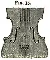 The principal varieties in the design of violins of the classical period will be illustrated by a comparison of Figs. 13, 14 and 15. Fig. 14 is from a violin by Stainer; Fig. 15, from a Tenor by Joseph Guarnerius. [For an illustration of a violin by Stradivari, see vol. iii. p. 728.] After Cremona, Venice among Italian towns produced the best fiddle-makers; then come Milan and Naples. The pupils and imitators of Stradivari maintained the reputation of the Italian Violins during the first half of the last century: but after 1760 the style of Italian violin-making shows a general decline. This is partly attributable to the fact that the musical world was by this time amply provided with instruments of the best class, and that the demand for them declined in consequence.
