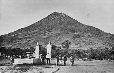 After leaving the fountain we began the very gradual ascent of the lower slope of the mountain, and at each turn in the road our eyes were charmed by lovely glimpses over coffee fincas and gardens full of flowers and flowering trees to the white walls and church towers of the old town below us slightly veiled in a summer mist.