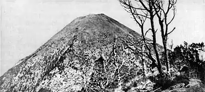 way to get a photograph of the cone, which lay to the left of us as we ascended; but the clouds came over just as I was ready, and I had to give it up. A little over 12,000 feet we left the scraggy pine-trees and arrived at the northern end of a cinder ridge, called the Meseta, which is at the summit of the slope we had been climbing. To the north of us, on the other side of