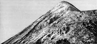 a deep rift, rose the distant cone of Acatenango, the highest of the three peaks of the mountain, covered with sparsely scattered pine-trees almost to the top; to the south, half a mile distant at the other end of the Meseta, rose the active cone of Fuego.