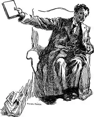 When I had finished I found myself standing in my own room with one arm raised, and, I suspect, a trace of tears in my eyes—there before the agent and Harriet. I saw Harriet lift one hand and drop it hopelessly. She thought I was captured at last. I was past saving. And as I looked at the agent I saw "grim conquest glowing in his eye!" So I sat down not a little embarrassed by my exhibition—when I had intended to be self-poised.