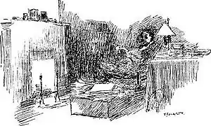 My own particular room, where I am permitted to revel in the desert of my own disorder, opens comfortably off the sitting-room. A lamp with a green shade stands invitingly on the table shedding a circle of light on the books and papers underneath, but leaving all the remainder of the room in dim pleasantness. At one side stands a comfortable big chair with everything in arm's reach, including my note books and ink bottle. Where I sit I can look out through the open doorway and see Harriet near the fireplace rocking and sewing. Sometimes she hums a little tune which I never confess to hearing, lest I miss some of the unconscious cadences. Let the wind blow outside and the snow drift in piles around the doorway and the blinds rattle—I have before me a whole long pleasant evening.