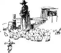 When you sit down you can look out between the starchiest of starchy curtains into the yard, where there is an innumerable busy flock of chickens. She keeps chickens, and all the important ones are named. She has one called Martin Luther, another is Josiah Gilbert Holland. Once she came over to our house with a basket, from one end of which were thrust the sturdy red legs of a pullet. She informed us that she had brought us one of Evangeline's daughters.