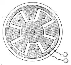 When the cylinder B with the charged coatings is rotated, a circuit connected to the terminals T is traversed by alternating currents. Another form of apparatus is illustrated in Fig. 2. In this apparatus the two sets of tin-foil coatings are glued on a plate of ebonite, and a similar plate which is rotated, and the coatings of which are charged as in Fig. 1, is provided.