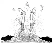 'Presently the gale increased, and the seas swelled up to the size of Ludgate Hill. Whole shoals of the passive skate arose to the surface and flopped warningly about our vessel. To leeward could be seen flocks of the wild sea shrike, whose ominous bark could be distinctly heard above the snort of the coming tempest. By now the cloud had half filled the heavens; the seas rose higher and higher; the din was terrific, as the wind tore from the sea shoal upon shoal of the shy sardine and whirled them through the air. Soon the ship was drenched in the high seas that continually broke over her and the quarts and quarts of rain that wolloped from the dense cloud now covering the whole sky and blotting out all light.