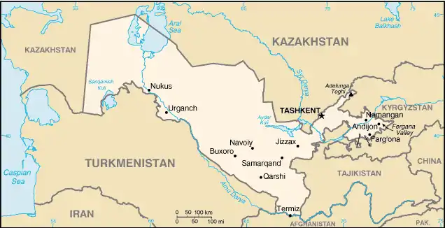 Administrative divisions: | 12 provinces (viloyatlar, singular - viloyat), 1 autonomous republic* (respublika), and 1 city** (shahar); Andijon Viloyati, Buxoro Viloyati, Farg'ona Viloyati, Jizzax Viloyati, Namangan Viloyati, Navoiy Viloyati, Qashqadaryo Viloyati (Qarshi), Qaraqalpog'iston Respublikasi* (Nukus), Samarqand Viloyati, Sirdaryo Viloyati (Guliston), Surxondaryo Viloyati (Termiz), Toshkent Shahri**, Toshkent Viloyati, Xorazm Viloyati (Urganch) note: administrative divisions have the same names as their administrative centers (exceptions have the administrative center name following in parentheses) |