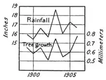Fig. 14.—Early test of correlation between tree-growth and rainfall by years; Flagstaff.