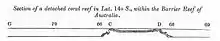 In the evening we anchored a mile from the S.W. side of a small detached reef, marked F in the chart, and distant 22 miles from Cape Flinders; the solitary position of this reef, it being four miles from the inner edge of the Great Barrier, and nine from the nearest part of the main, gave us a good opportunity of making a section, with a view of illustrating the progressive structure of coral edifices, in the still waters within the barrier reef; we accordingly visited the spot in the evening, and being an interesting object, we give a drawing of the section.