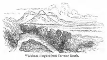 I availed myself of the opportunity of our halt at this place to wash my only suit, piece by piece, and afterwards made a sketch of the north-eastern part of Wickham Heights from the dry flat in the reach. The woodcut annexed will convey at once to the reader, those singular features in the hills—the low line of cliffs resembling fortifications near their summit, and, still more remarkable, the horizontal black streaks near their base.