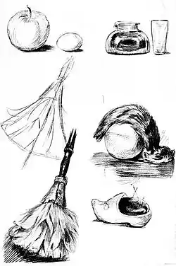 If we wish to handle our pencils intelligently (to get from our pencil many varied touches), we should draw objects which are variously composed. In other words, made of more than one material. And here again we must don our thinking-cap.