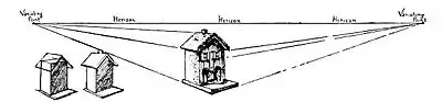 Pictures of interiors of houses are extremely interesting. There you note that the walls, floor, and ceiling (or rafters of the roof) diminish to the same vanishing point (because they lie parallel one to another), but that the chairs and tables, unless they are arranged parallel with the walls, have each a separate vanishing point, though each vanishing point must, of necessity, meet on the same horizon. (See Fig. 53)