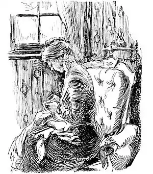 The little Japanese figure of papier mâché in my drawing (Fig. 105) has a face almost as white as the white edge of the stand. She turns to the light and presents a narrow upright shape. The glossy hair has dark shadows, not quite so dark as the dark folds behind the sleeve and sash. A broad white shadow lies over the upper part of the back.