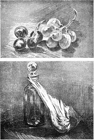 Seen through half-closed eyes the silver is a shimmer of lights and soft reflections, and requires a few careful strokes of white and black chalk, following the shapes as closely as possible, making good use of the definite lights and shades on the rim, the barrel, and the twisted support. The light catches the edges of the dark book; also there are slight reflections on the polished table. You may now suggest the middle lights, leaving the paper itself to express the middle tones.