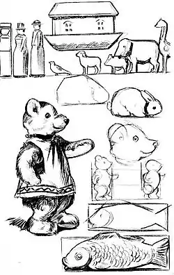 The toy tree is stiff and still, but has the look of a tree; Mr Noah is straight and long, but Mr Noah is a man and he has sheep, cows, pigs, and birds; though made of wood, these have a queer resemblance to their originals.