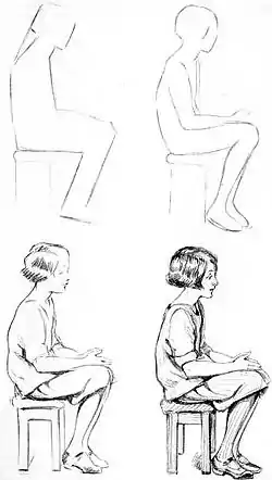 Having arrived at the arms and hands we continue with the lower limbs, tucking in the skirt (folds can be very misleading) to show the upper part of the thigh. The square angle resting upon the seat of the stool is sharply defined. The knee is more or less hidden, but ask Kathleen to touch the knees where they bend, or hold the skirt tightly across the knees, and mark it well in your mind, or on your paper, because from there we trace the lower part of the leg.