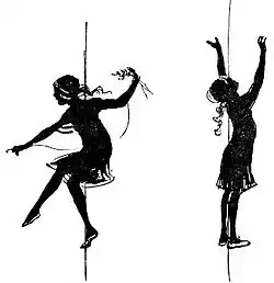 In Fig. 8 are shown a couple of silhouettes of figures in action to emphasize this principle. Suppose you were hopping on one leg, or dancing on your toe, or standing upright with your arms above your head, and Michael or Peter gave you a push, as brothers sometimes do, you would at once lose your balance—and the figure in your drawing will overbalance if you do not rightly plant him upon whatever is to support him.